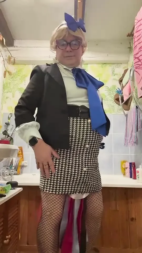 Küçük bir gingham eteğiyle şişeye işemek için giyinmiş